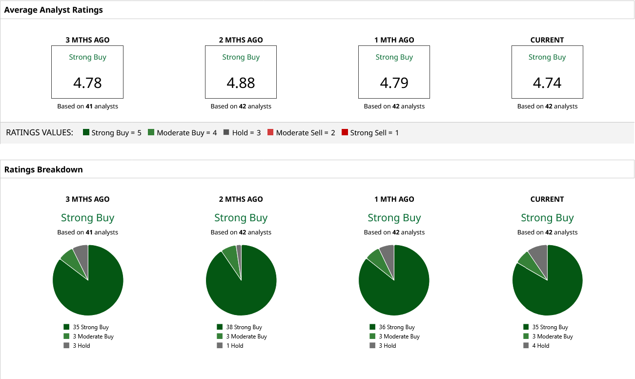 Thus, unsurprisingly, analysts have earmarked an overall rating of “Strong Buy” for AVGO stock, with a mean target price of $467.64. This indicates an upside potential of about 32% from current levels. Out of 42 analysts covering the stock, 35 have a “Strong Buy” rating, three have a “Moderate Buy” rating, and four have a “Hold” rating.