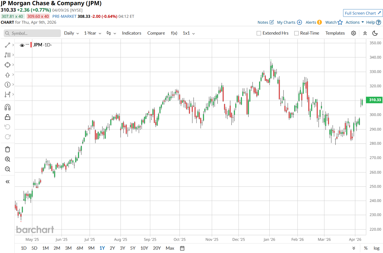JPMorgan Chase's portfolio includes consumer banking, corporate lending, asset management, and capital markets. So it sits in the middle of almost every part of the financial system. Over the past 52 weeks, the stock is up 36.44%, but down 3.83% year-to-date (YTD).