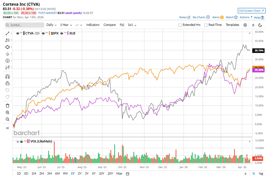 CTVA stock has outperformed the S&P 500 Index’s ($SPX) 28.4% gains over the past 52 weeks, with shares up 40.9% during this period. Similarly, it outperformed the State Street Materials Select Sector SPDR ETF’s (XLB29.7% returns over the same time frame.