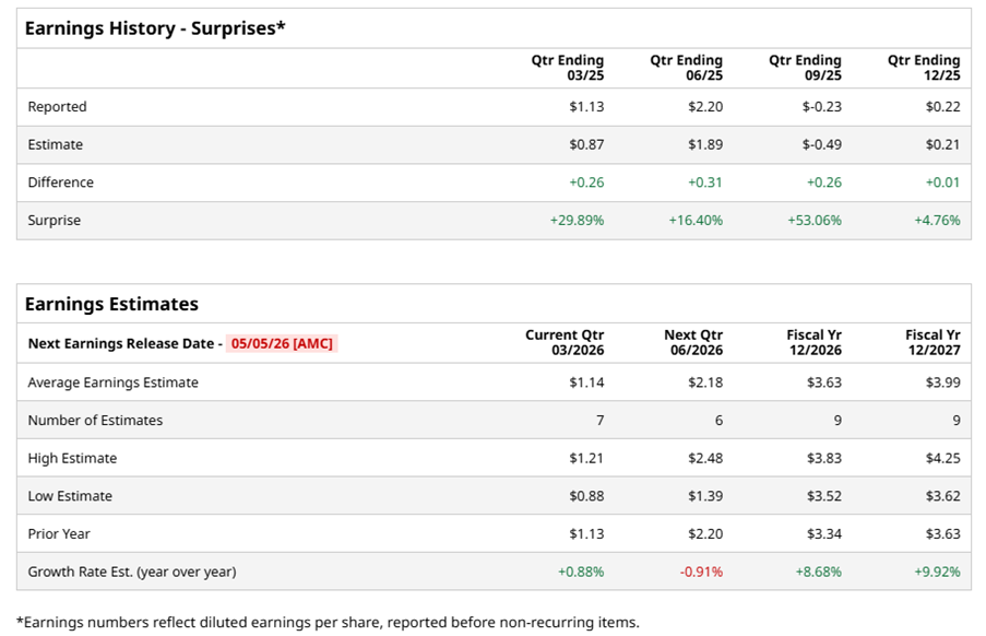 Indianapolis, Indiana-based Corteva, Inc. (CTVA) provides seed and crop protection solutions, which engages in the agriculture industry and food supply. Valued at $56.3 billion by market cap, the leading agricultural company offers seeds and crop protection products, as well as software solutions and digital services. The agricultural chemical and seed major is expected to announce its fiscal first-quarter earnings for 2026 after the market closes on Tuesday, May 5.