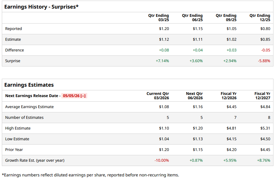 IFF is expected to release its Q1 2026 earnings soon. Ahead of the event, analysts expect the company’s EPS to be $1.08 on a diluted basis, down 10% from $1.20 in the year-ago quarter. The company has exceeded Wall Street’s EPS estimates in three of its last four quarters, while missing on one occasion.