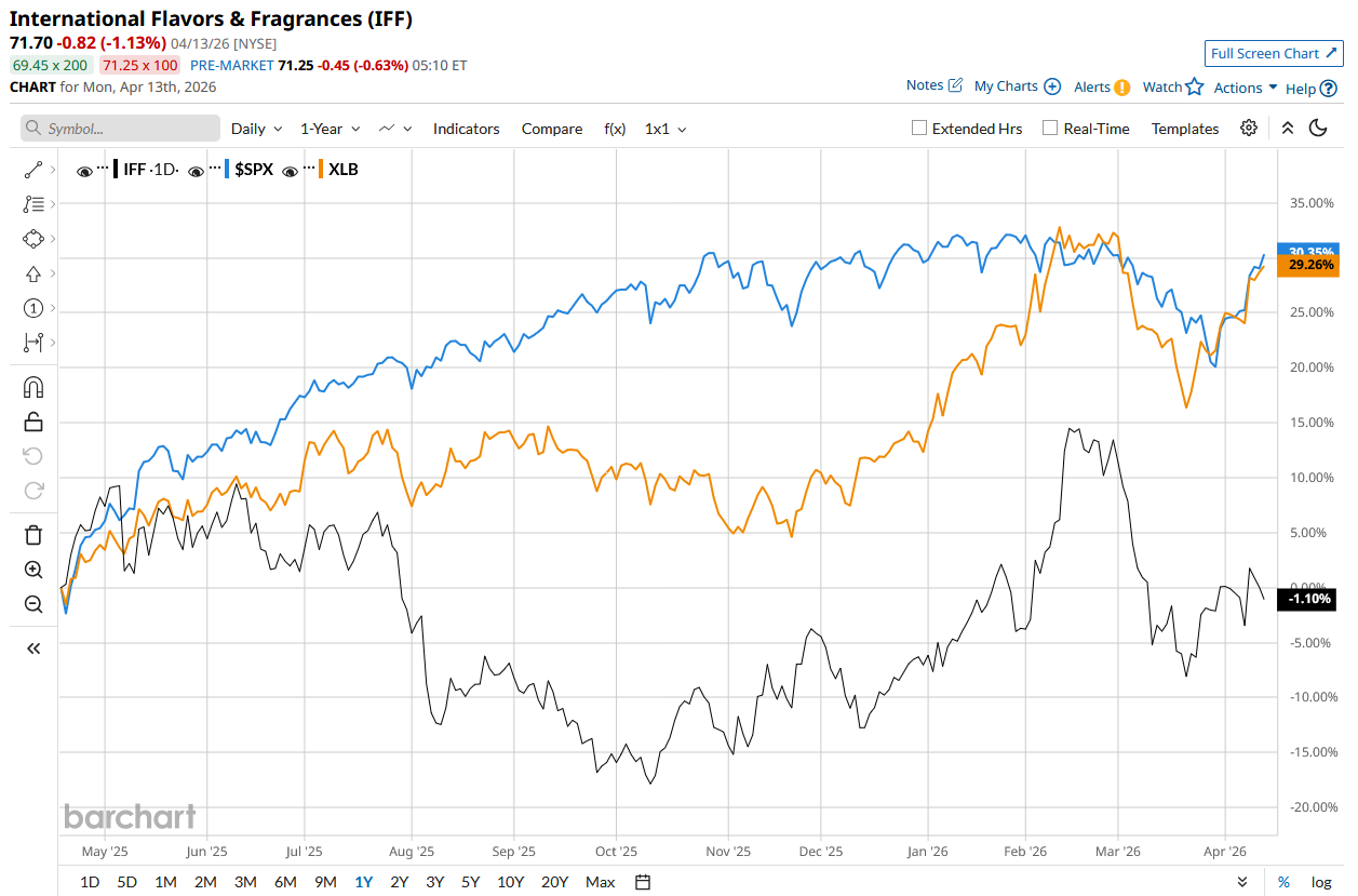 IFF stock has declined 2% over the past 52 weeks, underperforming the S&P 500 Index’s ($SPX28.4% rise and the State Street Basic Materials Select Sector SPDR ETF’s (XLB30% rise during the same time frame.