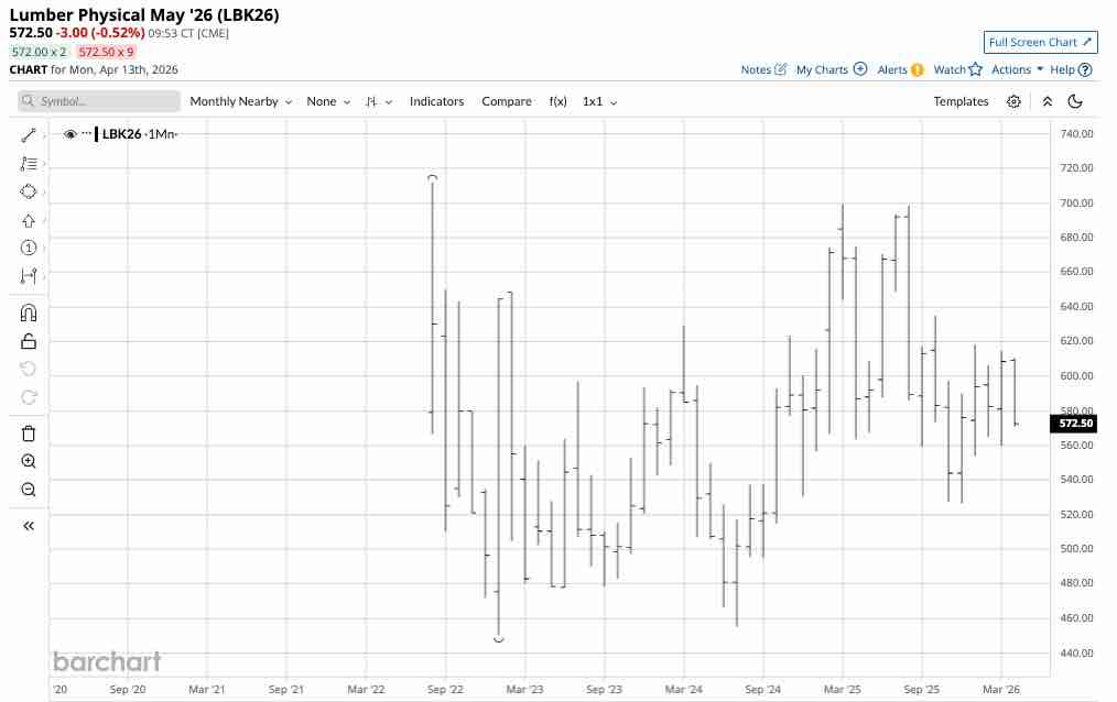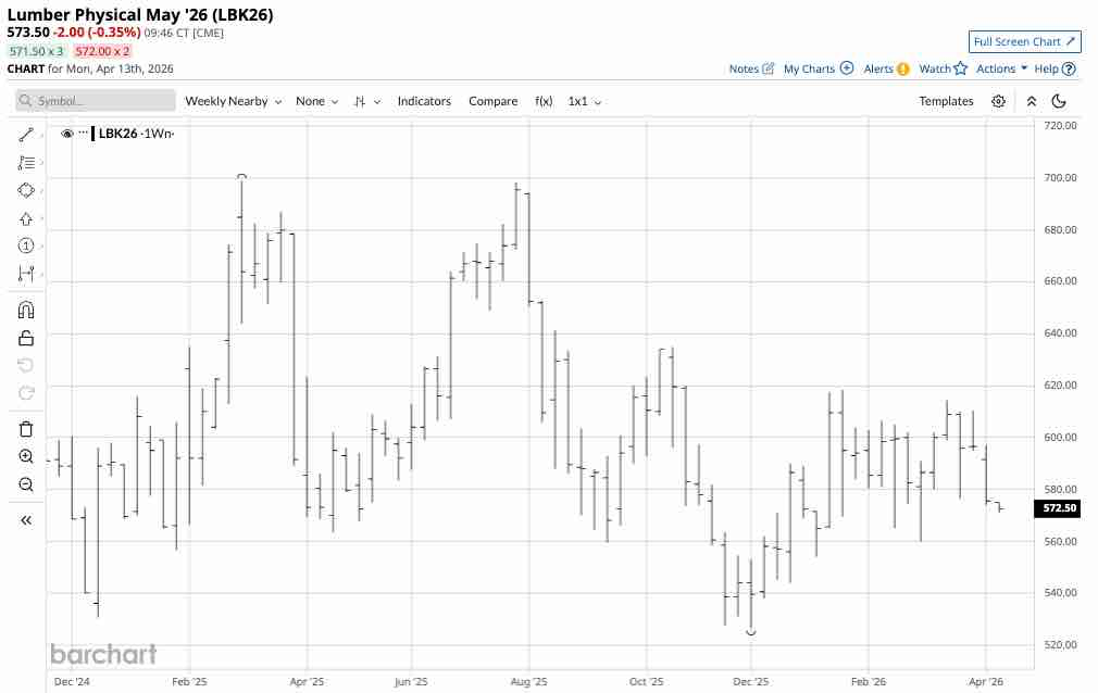 In mid-April, the May physical lumber futures at below $575 per 1,000 board feet level are trading around the middle of the range from December 2025.