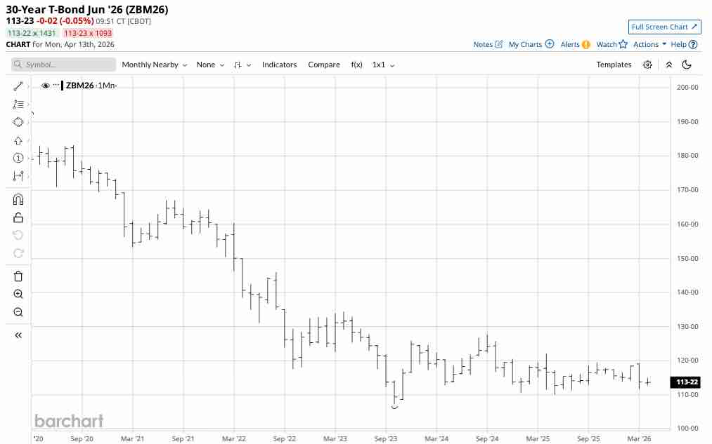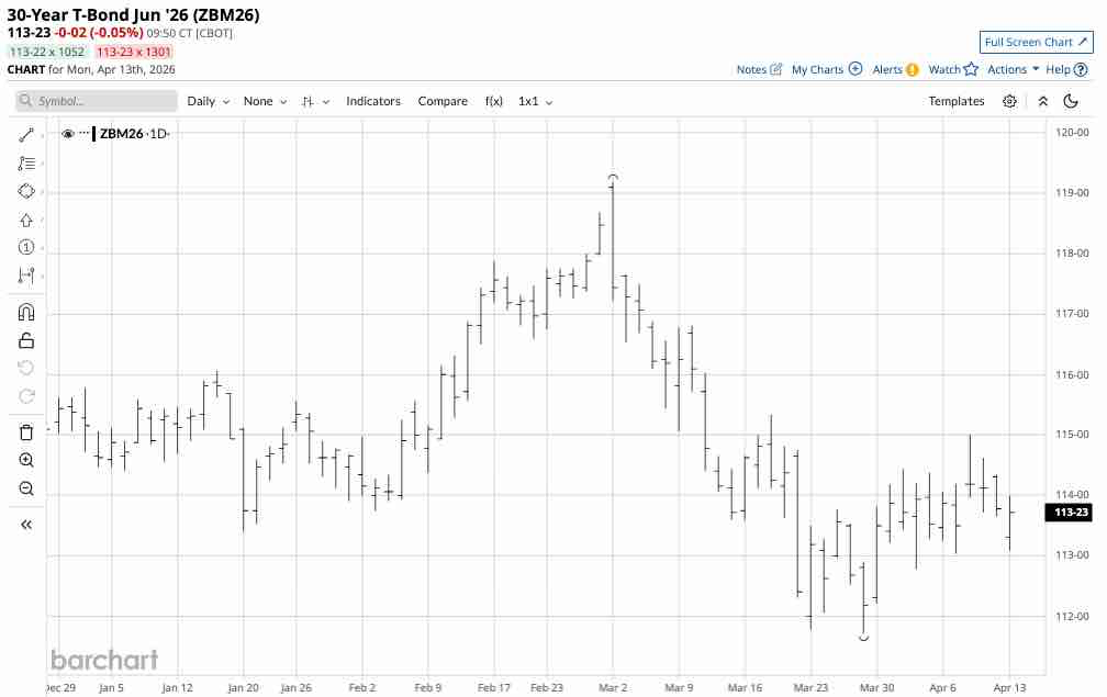 The daily chart of U.S. 30-year Treasury bond futures shows that bond prices fell and interest rates rose after the late February hostilities.