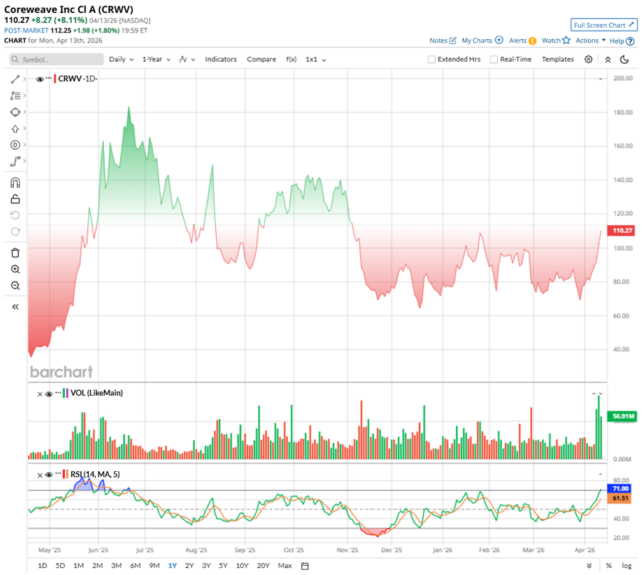 Even then, the bigger trend remains strong. CRWV is still up 170.65% over the past 52 weeks and 64.82% year-to-date (YTD). Momentum has picked up sharply in recent weeks, with the stock rising 45.52% in a month and over 38.47% in just the past five days, largely driven by the Anthropic deal news.