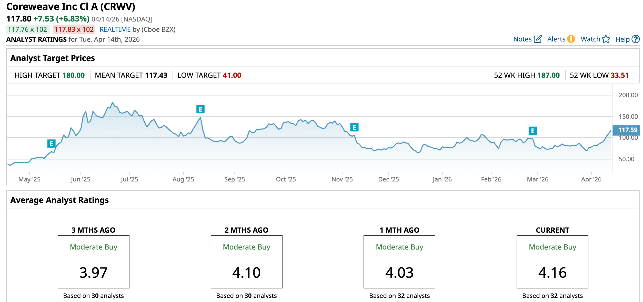 The consensus rating on CRWV stock remains at “Moderate Buy.” Among 32 analysts covering the stock now, 19 advise a “Strong Buy,” one suggests a “Moderate Buy,” 11 analysts are playing it safe with a “Hold” rating, and the remaining one analyst remains skeptical with a “Strong Sell.”