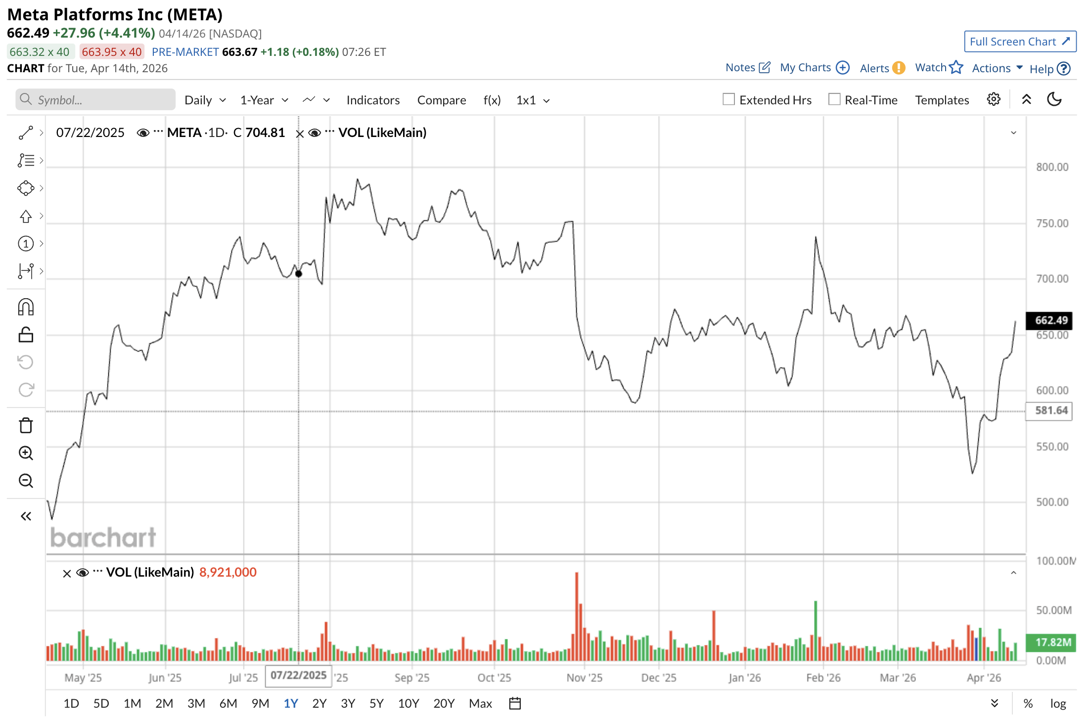 META stock jumped 4.4% on Tuesday and has been on the rise throughout trading today, while AVGO rose less than 1% yesterday but is up over 3% today.