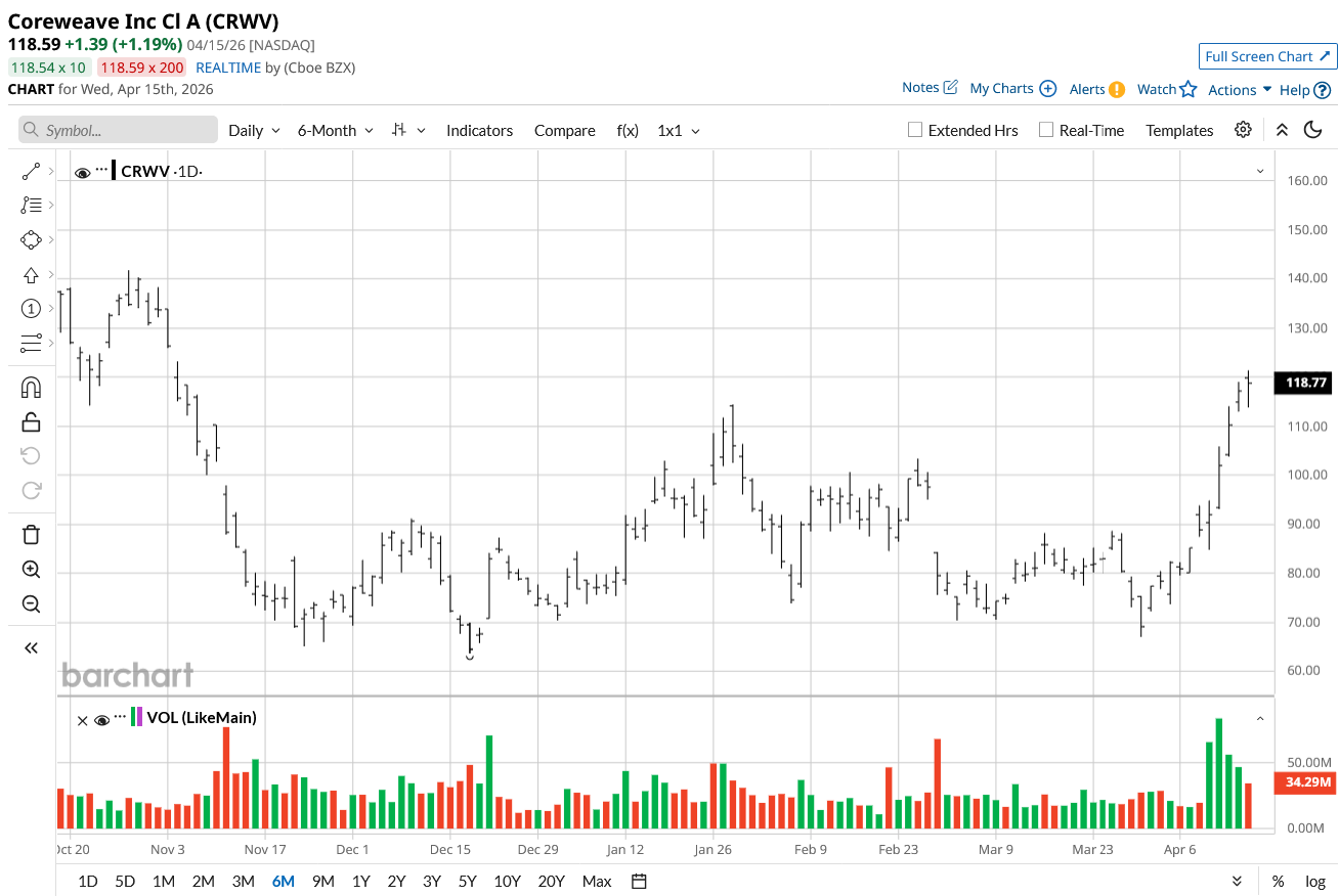 Based on 32 Wall Street analyst forecasts, CRWV stock has a consensus “Moderate Buy” rating. The most bullish analyst forecast suggests that the stock could rise to $180, reflecting an impressive upside of approximately 52%.