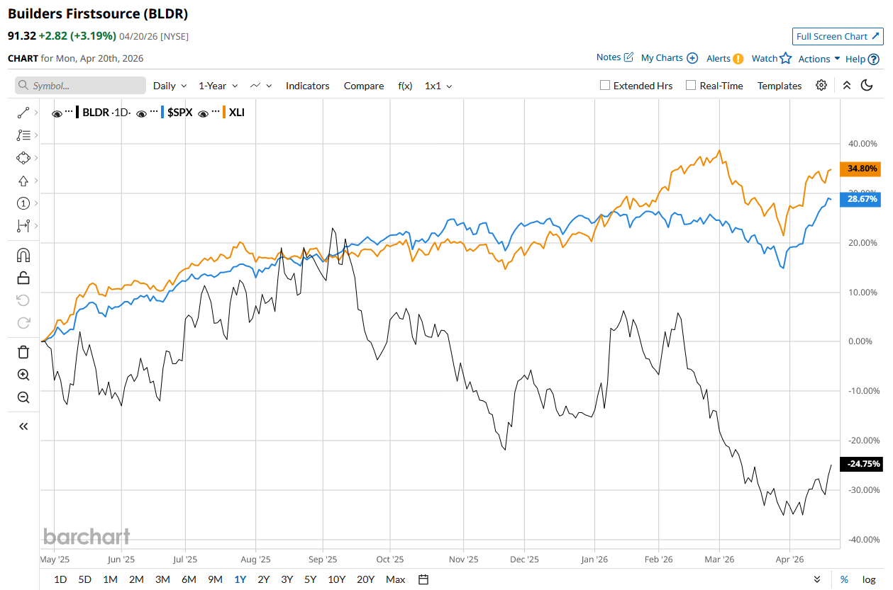 BLDR’s stock has declined 21.9% over the past 52 weeks, underperforming the S&P 500 Index’s ($SPX) 34.6% rise and the State Street Industrials Select Sector SPDR ETF’s (XLI) 38.8% return during the same time frame.