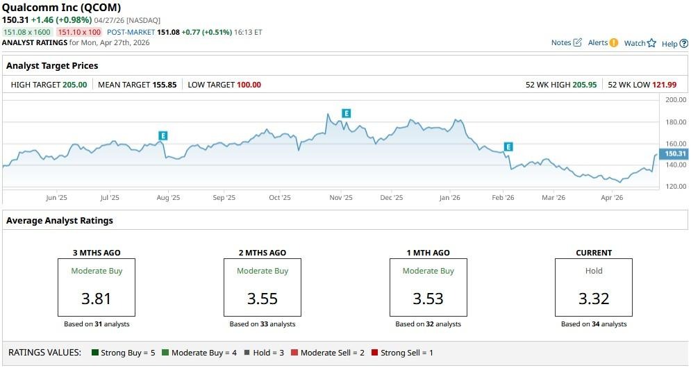 According to Barchart, while the consensus rating on QCOM stock sits at a “Hold," price targets go as high as $205 currently, indicating potential upside of more than 35% from here.