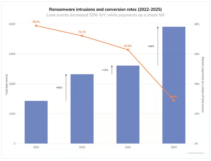 The cybercrime business is booming, at least on paper. According to a new report from blockchain analytics firm Chainalysis, the number of ransomware attacks jumped 50% in 2025, with nearly 8,000 separate incidents recorded throughout the year. Yet for all that hustle, hackers walked away with less cash than the year before.