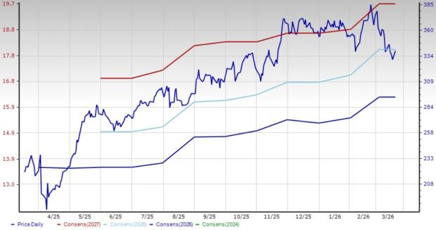 Crocs: The designer, developer, manufacturer, marketer and distributor of casual lifestyle footwear and accessories currently holds a Zacks Rank #2. Crocs is progressing with the long-term strategy and key initiatives aimed at delivering sustainable growth. The company is strengthening brand relevance by leveraging and expanding its iconic clog franchise through innovation while also diversifying across sandals, cozy footwear and personalization offerings. Crocs continues to invest in high-potential markets through targeted marketing, digital engagement and direct-to-consumer channels, alongside expanding its global distribution footprint to build market share across the brand portfolio.