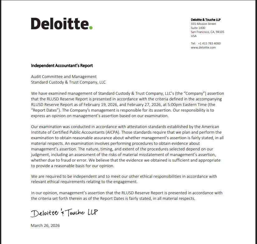 Eligible options include short-term US Treasuries, overnight reverse repurchase agreements, insured bank deposits, and approved money-market funds. According to Deloitte’s report, RLUSD’s reserve structure meets all of those requirements.