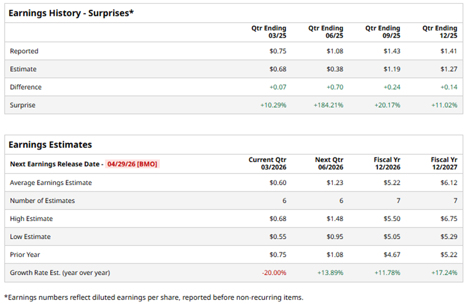 The New Britain, Connecticut-based company is expected to announce its fiscal Q1 2026 results before the market opens on Wednesday, Apr. 29. Ahead of this event, analysts forecast SWK to report an adjusted EPS of $0.60, down 20% from $0.75 in the year-ago quarter. However, it has surpassed Wall Street's earnings estimates in the last four quarters.
