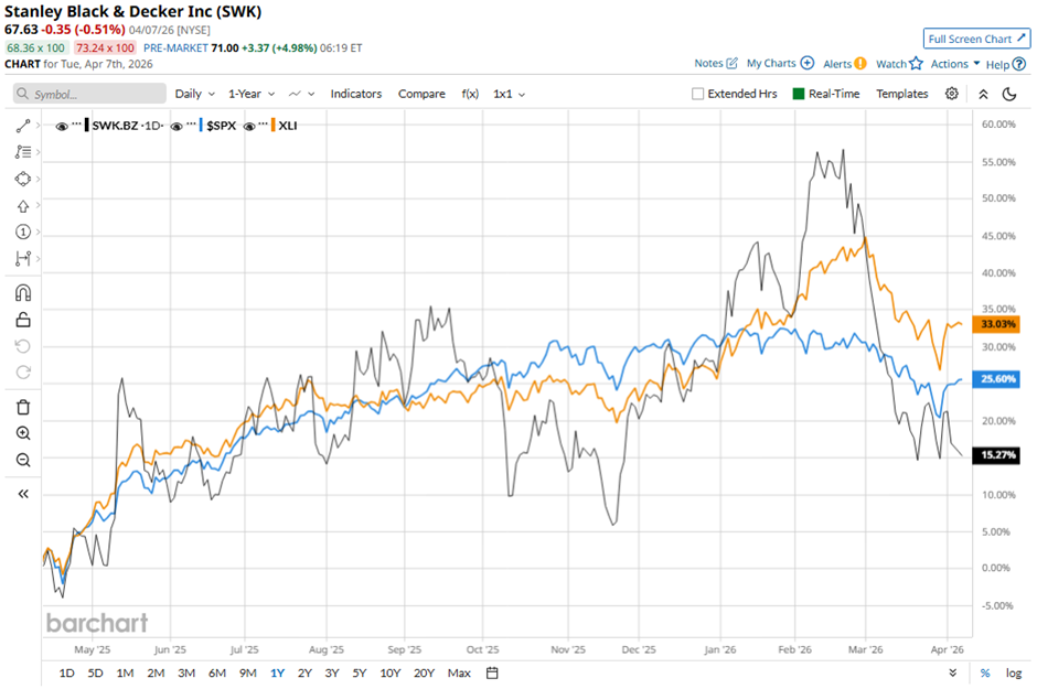 Shares of Stanley Black & Decker have increased 14.1% over the past 52 weeks, lagging behind both the S&P 500 Index's ($SPX30.7% gain and the State Street Industrial Select Sector SPDR ETF’s (XLI39.9% surge over the same period.