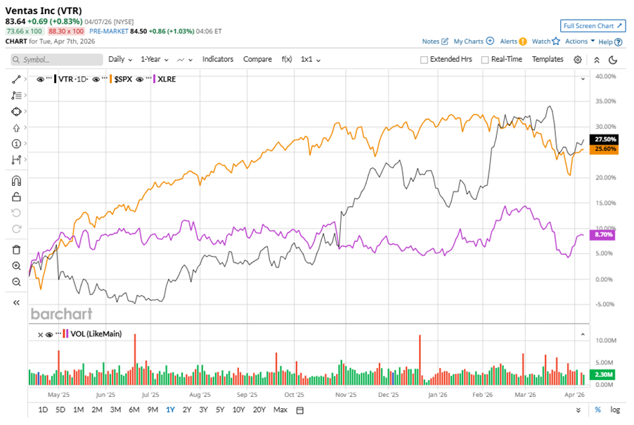 VTR stock has underperformed the S&P 500 Index’s ($SPX) 30.7% gains over the past 52 weeks, with shares up 30.4% during this period. However, it notably outpaced the State Street Real Estate Select Sector SPDR ETF’s (XLRE9.7% uptick over the same time frame.
