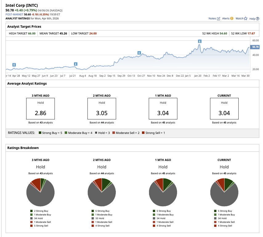 Wall Street believes INTC stock is an overall “Hold.” Of the 45 analysts covering the stock, five rate it a “Strong Buy,” one has a “Moderate Buy” rating, 34 analysts rate it a “Hold,” one analyst has a “Moderate Sell,” and four suggest a “Strong Sell" rating. INTC stock has surpassed its average target price of $45.26. However, the Street-high estimate of $66 suggests INTC stock has potential upside of 13% over the next 12 months.