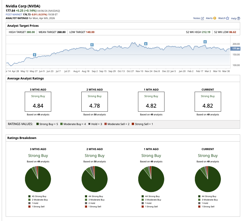 Overall, NVDA stock remains a “Strong Buy” on Wall Street. Out of the 49 analysts covering the stock, 44 have a “Strong Buy” recommendation, three rate it a “Moderate Buy,” one rates it a “Hold,” and one analyst has a “Strong Sell" rating. The mean target price of $268.80 implies potential upside of 48% from current levels. Plus, the high price estimate of $380 suggests that NVDA stock could rally as much as 109% over the next 12 months.