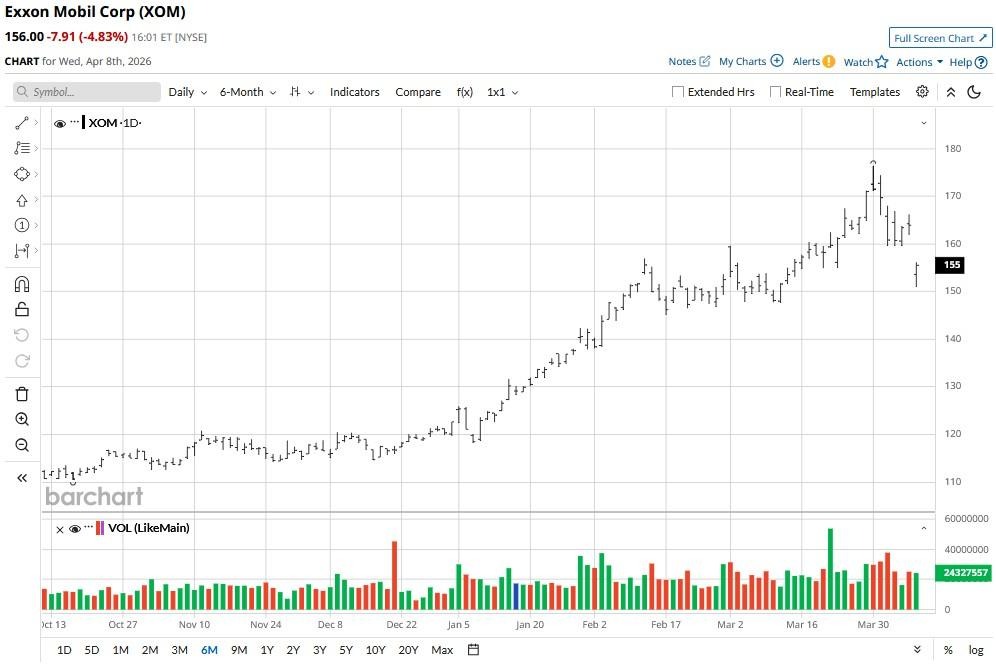 XOM shares tumbled on April 8 mostly because a ceasefire is now on the table, and it’s evaporating the supply-side fear that drove Brent crude (CBM26) toward its high of about $120.