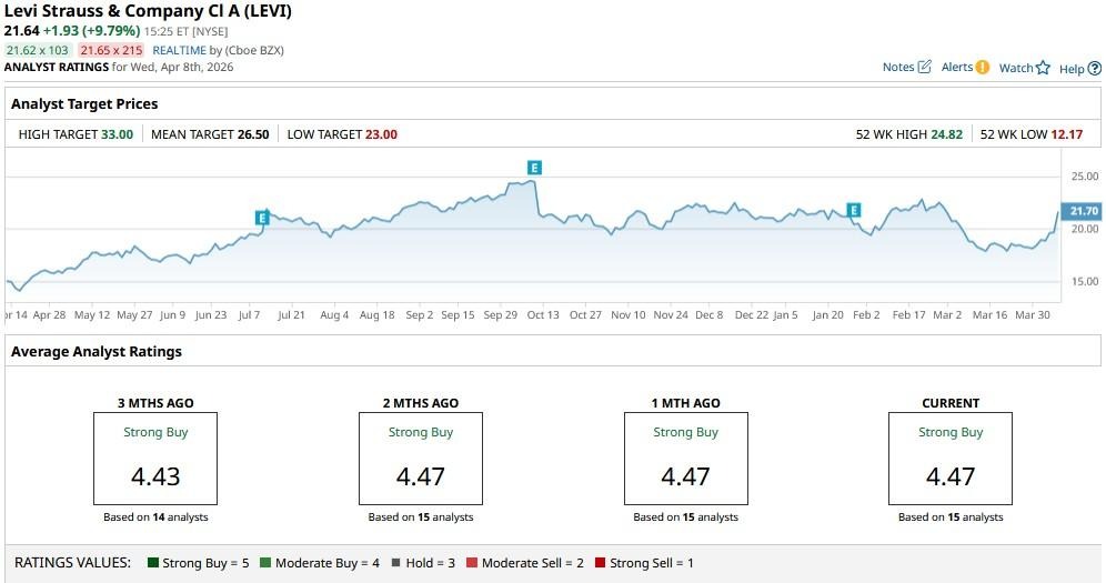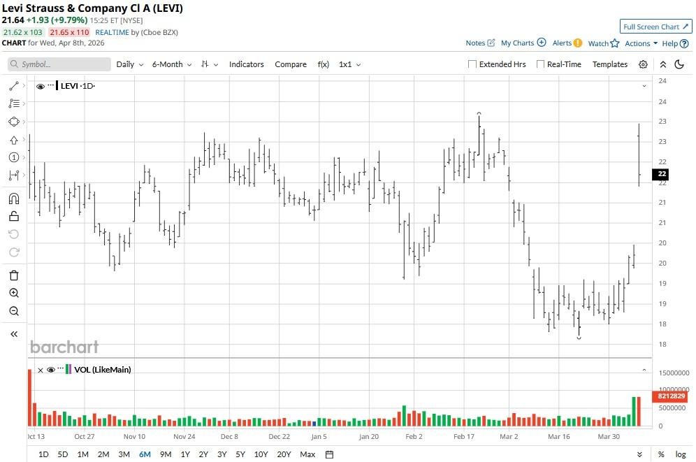 Levi Strauss (LEVI) stock rallied on April 8 after the iconic denim maker reported a strong Q1 and raised its profit and revenue guidance for the full fiscal 2026.