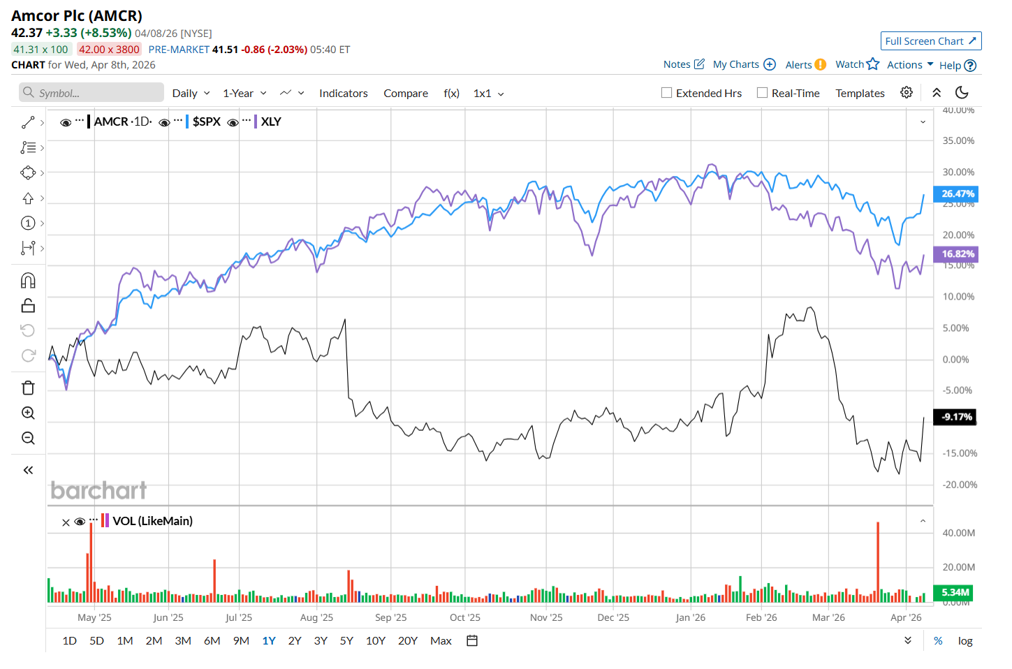 AMCR has declined 1.1% over the past 52 weeks, trailing both the S&P 500 Index's ($SPX36.1% return and the State Street Consumer Discretionary Select Sector SPDR ETF’s (XLY25.7% uptick over the same time period.