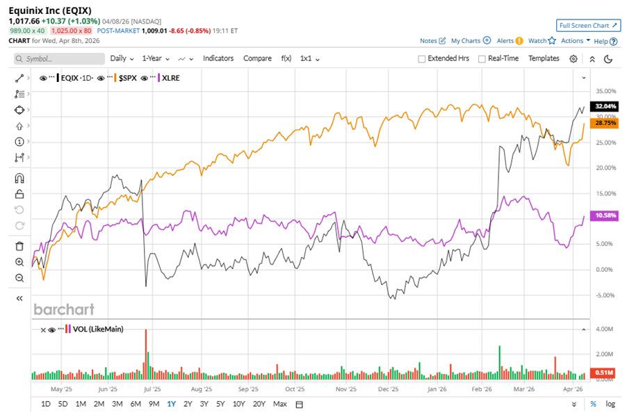 EQIX stock has outperformed the S&P 500 Index’s ($SPX) 36.1% gains over the past 52 weeks, with shares up 37.5% during this period. Similarly, it outperformed the State Street Real Estate Select Sector SPDR ETF’s (XLRE14.5% uptick over the same time frame.