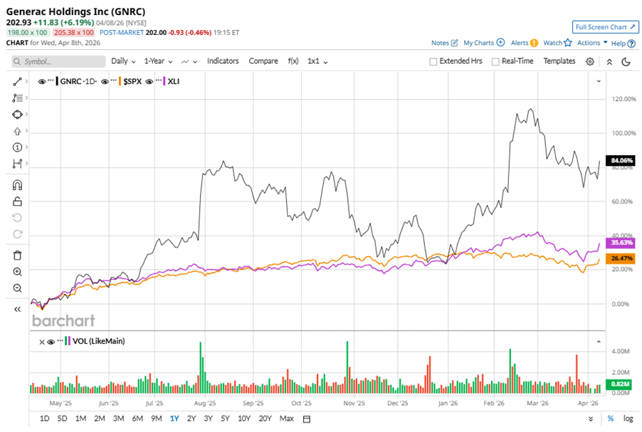GNRC stock has notably outperformed the S&P 500 Index’s ($SPX) 36.1% gains over the past 52 weeks, with shares up 99.1% during this period. Similarly, it considerably outperformed the State Street Industrial Select Sector SPDR ETF’s (XLI46.4% gains over the same time frame.