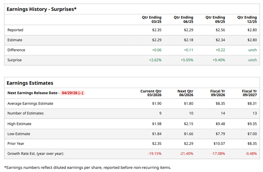Ahead of the event, analysts expect QCOM to report a profit of $1.90 per share on a diluted basis, down 19.2% from $2.35 per share in the year-ago quarter. The company has surpassed or met Wall Street’s EPS estimates in its last four quarterly reports.