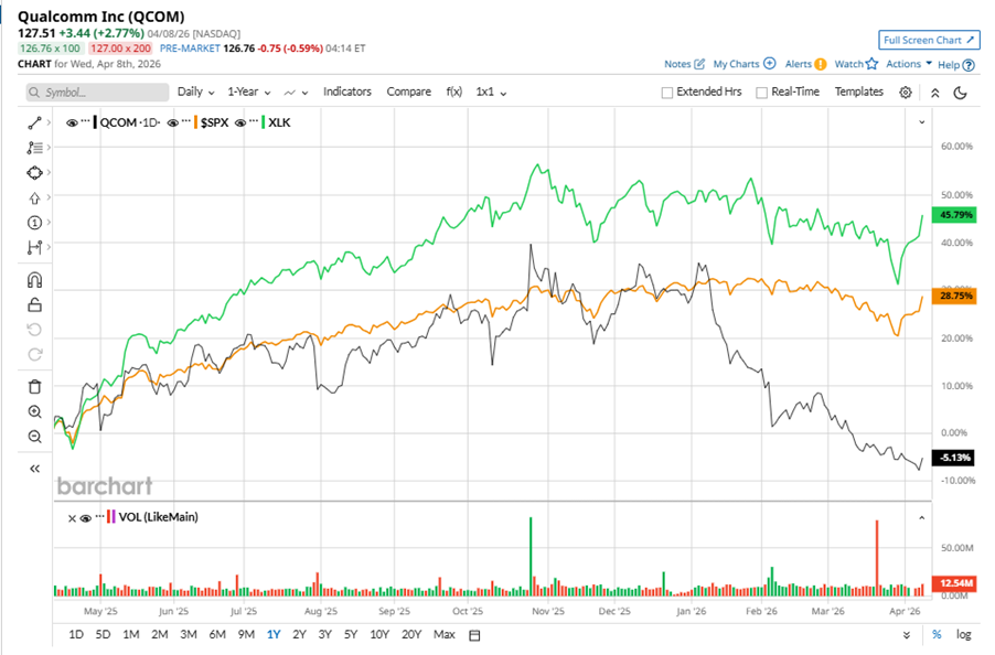 QCOM stock has underperformed the S&P 500 Index’s ($SPX) 36.1% gains over the past 52 weeks, with shares up 2.3% during this period. Similarly, it underperformed the State Street Technology Select Sector SPDR ETF’s (XLK) 57.7% returns over the same time frame.