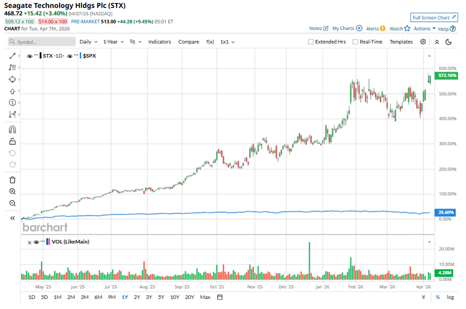 Currently commanding a market capitalization of about $102.22 billion, Seagate has become one of the most explosive winners of the AI-driven rally. The stock has surged an eye-popping 645.87% over the past year, massively outperforming the broader S&P 500 Index ($SPX), which gained just 36.13% in the same period. And the momentum hasn’t slowed in 2026.