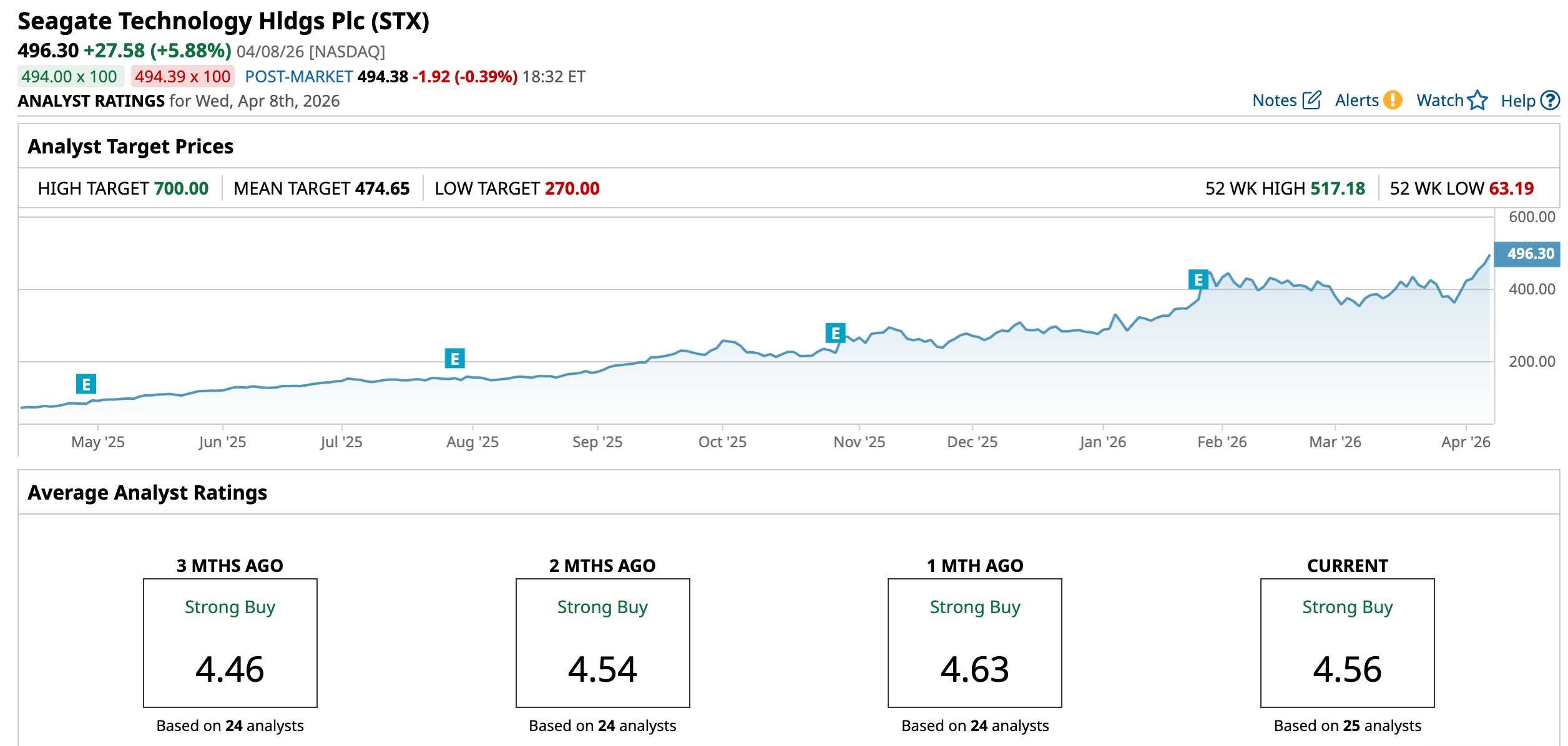 Shares are already up 80.22% year-to-date (YTD), even as the broader market has slipped 0.92% into the red, highlighting just how strong investor appetite remains for AI-linked infrastructure plays like Seagate. Following its record high on Apr. 6, sparked by Morgan Stanley's bullish call, the stock continues to hover near peak levels, signaling sustained confidence and leaving investors watching closely for the next leg of upside.
