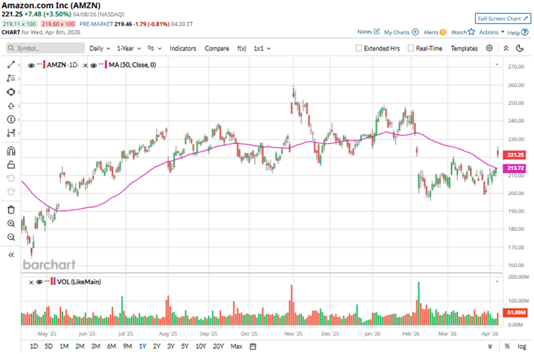 Over the past 52 weeks, Amazon’s stock has gained 22.26%. However, it has come under pressure recently as investors have been spooked by the company’s AI and cloud infrastructure spending. The shares are down 1.22% year-to-date (YTD). It had reached a 52-week high of $258.60 in Nov. 2025, but is down 9.65% from that level.