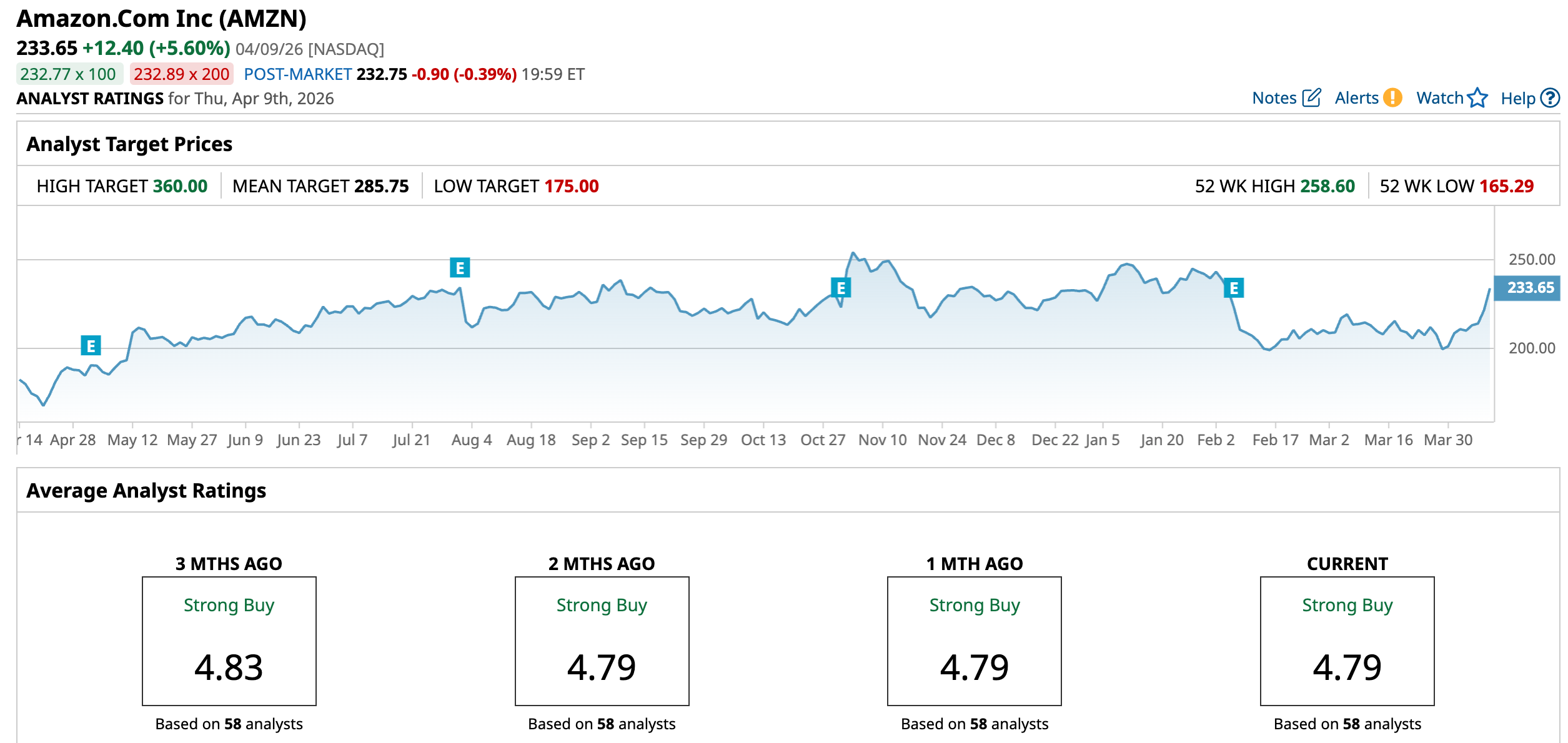 Amazon has been in the spotlight on Wall Street for some time now, with analysts awarding it a consensus “Strong Buy” rating overall. Of the 58 analysts rating the stock, a majority of 49 analysts have given it a “Strong Buy” rating, six analysts suggest “Moderate Buy,” while three analysts are playing it safe with a “Hold” rating. The consensus price target of $285.75 represents 22.3% upside from current levels. The Street-high price target of $360 indicates a 54.1% upside.