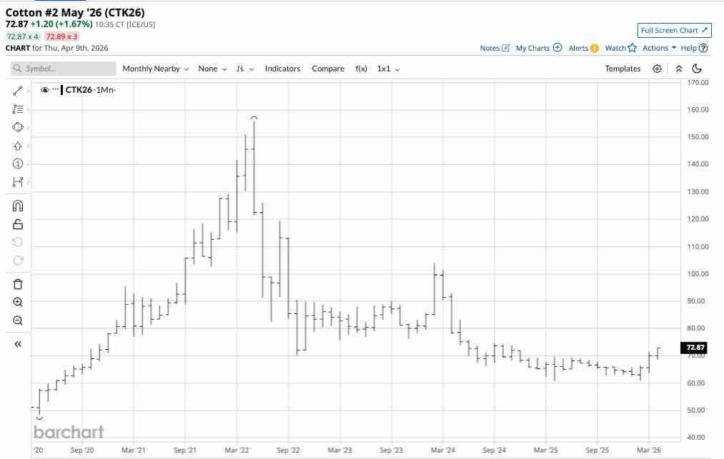 Nearby ICE cotton futures for May 2026 delivery have recovered from the February 6, 2026, low of 60.90 cents per pound.