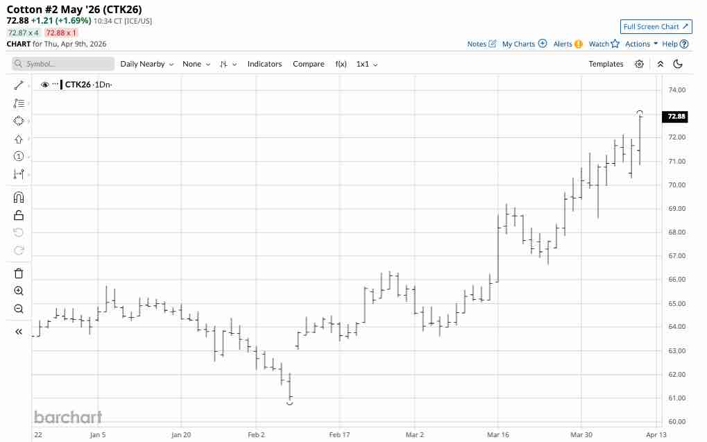 The daily continuous contract chart shows that cotton futures rallied 19.8% to a high of 72.97 cents per pound on April 9, 2026.