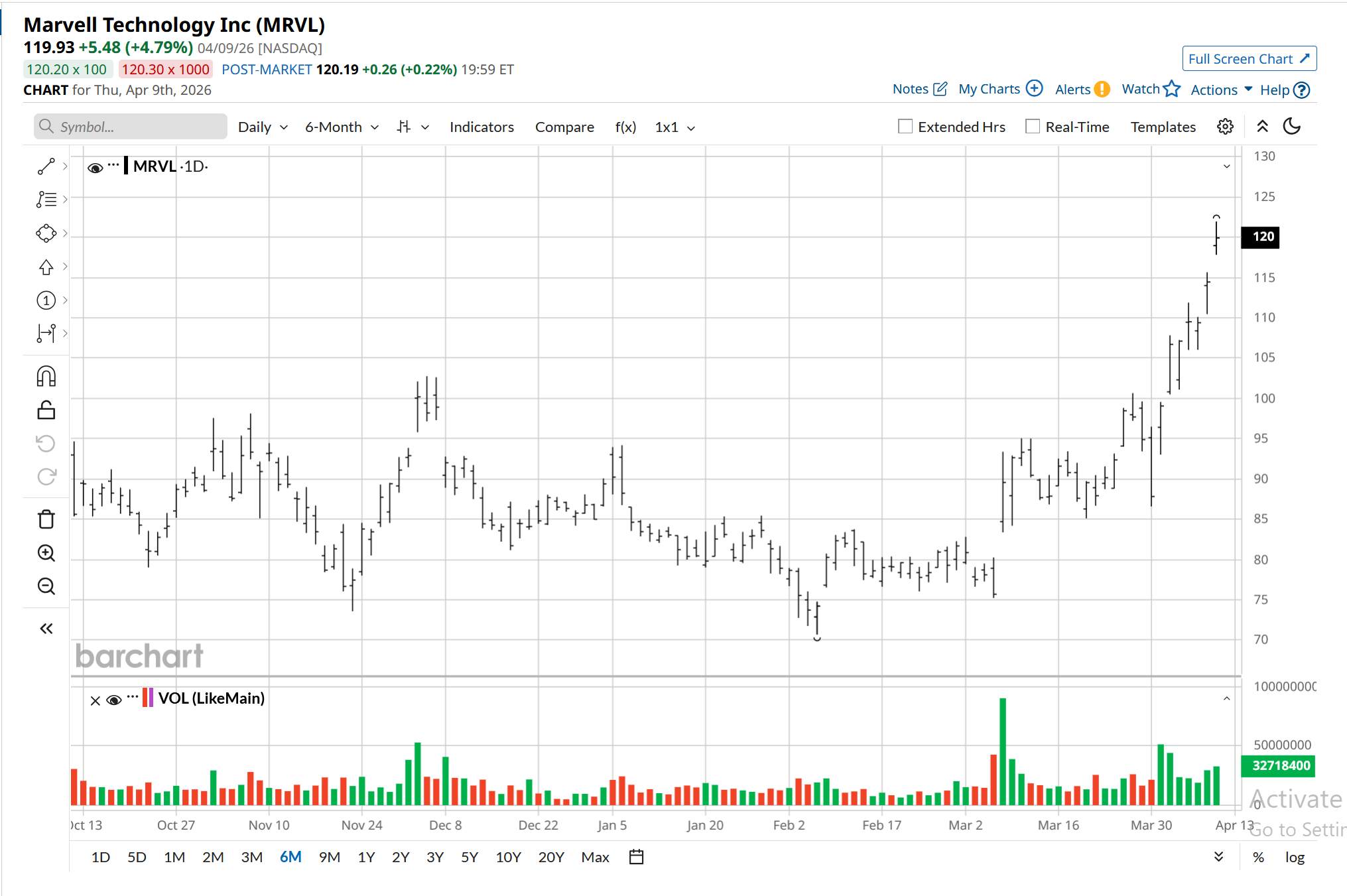 Fast forward to April 2026 and Marvell is trading at about the same share price as in December 2024. This recovery happened after MRVL stock dropped 60% from its December 2024 all-time high. While the current stock price may look familiar to those who were holding shares back then, the bull thesis has completely changed according to Barclays.