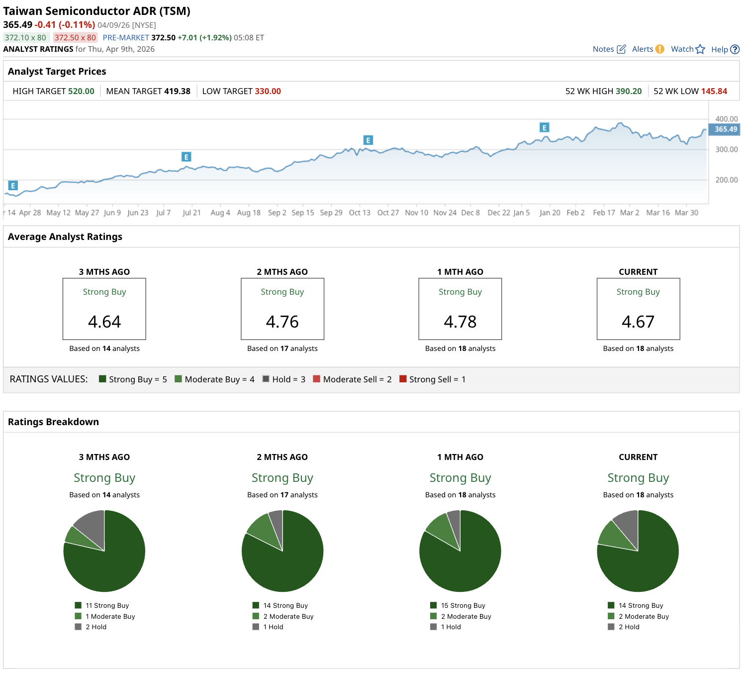 Analysts continue to have a “Strong Buy” consensus rating for TSM stock. Of the 18 analysts with coverage, 14 analysts have a "Strong Buy" rating, two analysts have a "Moderate Buy" rating, and two rate TSM stock as a “Hold.”