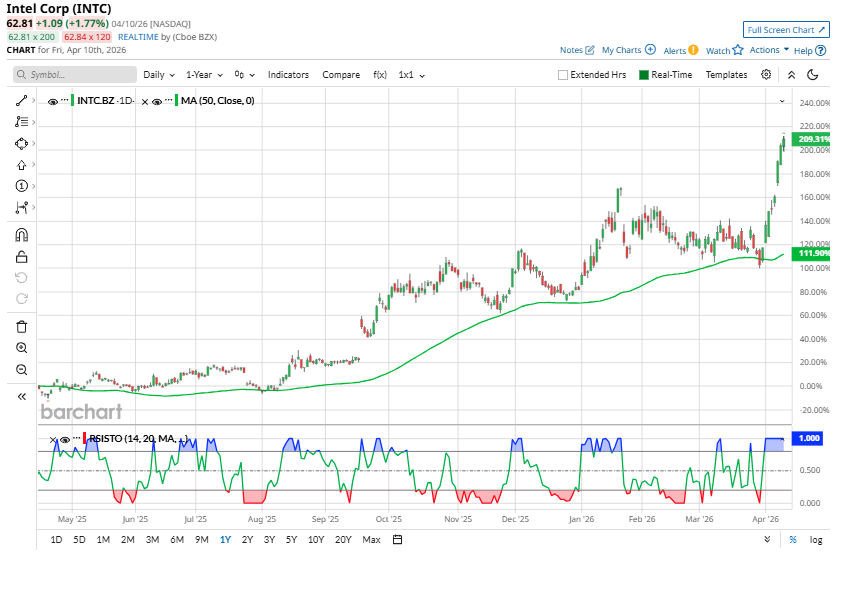Intel’s long-term growth outlook remains positive. However, INTC stock has already rallied substantially, rising approximately 216% over the past year. This strong performance suggests that a significant portion of optimism may already be reflected in Intel’s current valuation.
