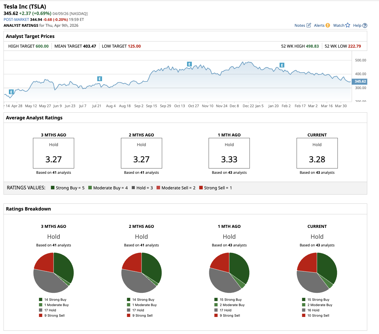 Tesla currently has a consensus “Hold” rating. Out of the 43 analysts covering TSLA stock, 15 recommend a “Strong Buy” rating, two recommend a “Moderate Buy,” 16 recommend a “Hold” rating, and 10 recommend a “Strong Sell.” The average TSLA stock price target is $403.47, implying potential upside of 16% from current levels.