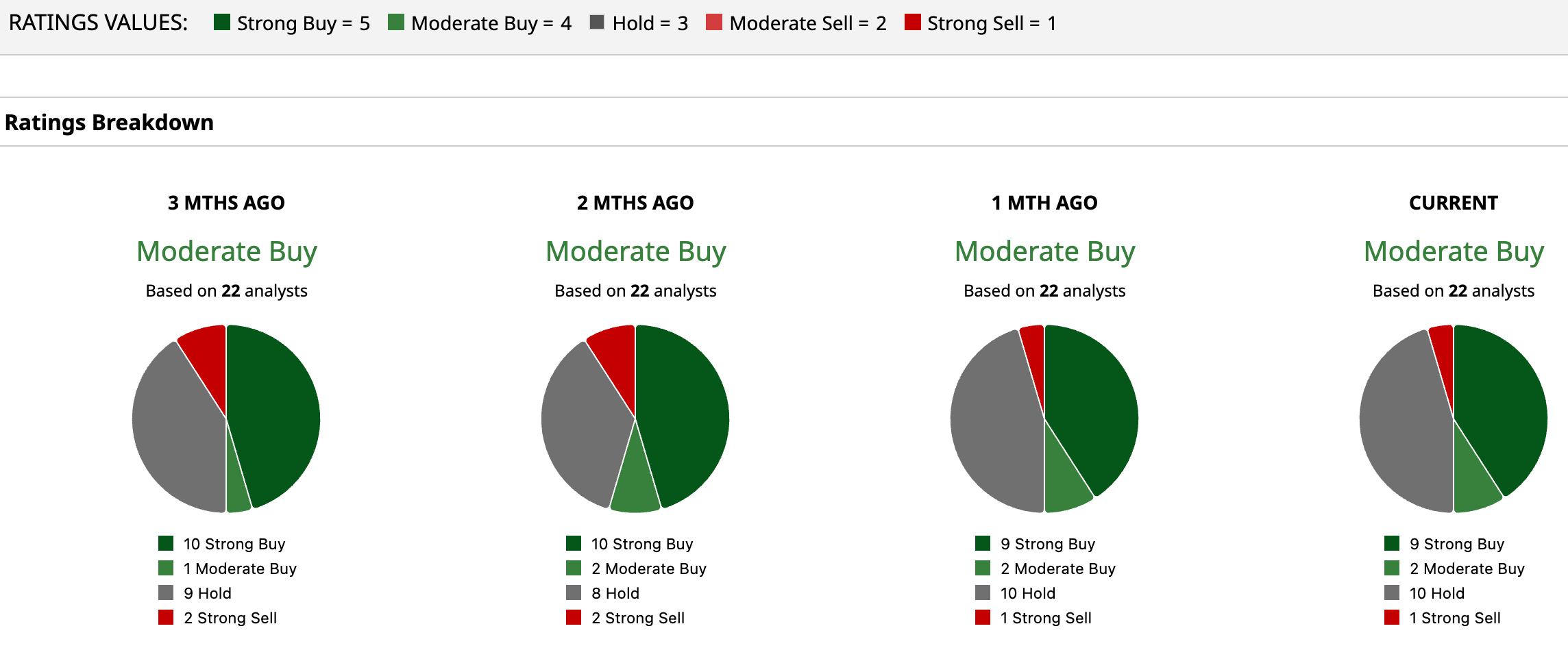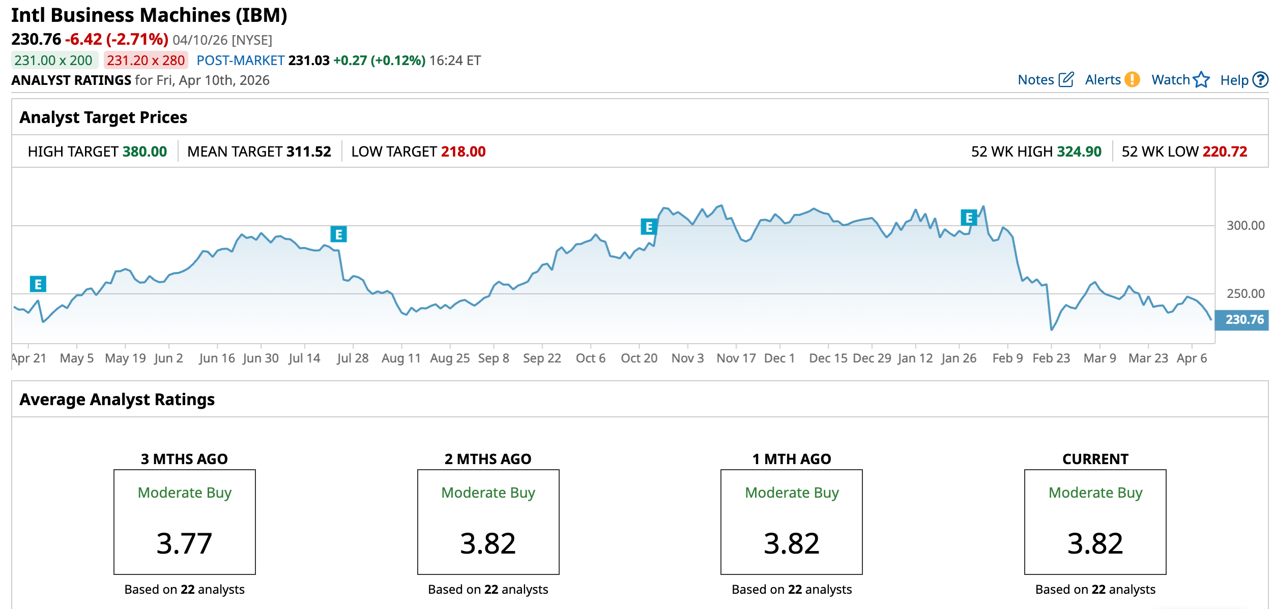 Still, IBM stock is currently carrying an overall rating of “Moderate Buy.” Among 22 analysts covering the stock, nine have assigned it a “Strong Buy,” two maintain a “Moderate Buy,” 10 recommend “Hold,” and one has assigned a “Strong Sell.”