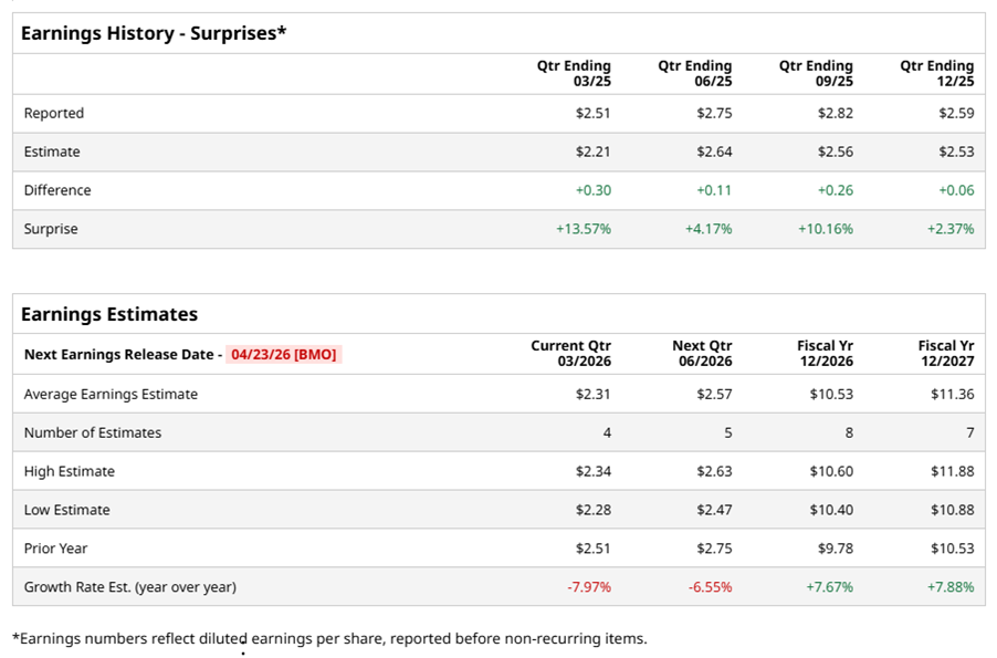 Charlotte, North Carolina-based Honeywell International Inc. (HON) provides aerospace technologies, control and security solutions for commercial buildings, industrial automation, and process technology for the energy transition. Valued at $149.4 billion by market cap, its business is aligned with three powerful megatrends - automation, the future of aviation, and energy transition, underpinned by its Honeywell Accelerator operating system and Honeywell Forge IoT platform. The diversified industrial conglomerate is expected to announce its fiscal first-quarter earnings for 2026 before the market opens on Thursday, Apr. 23.