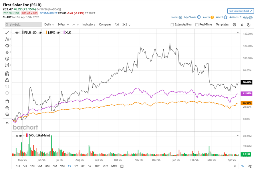 FSLR stock has outperformed the S&P 500 Index’s ($SPX) 29.4% gains over the past 52 weeks, with shares up 66.5% during this period. Similarly, it outperformed the State Street Technology Select Sector SPDR ETF’s (XLK) 46.8% returns over the same time frame.