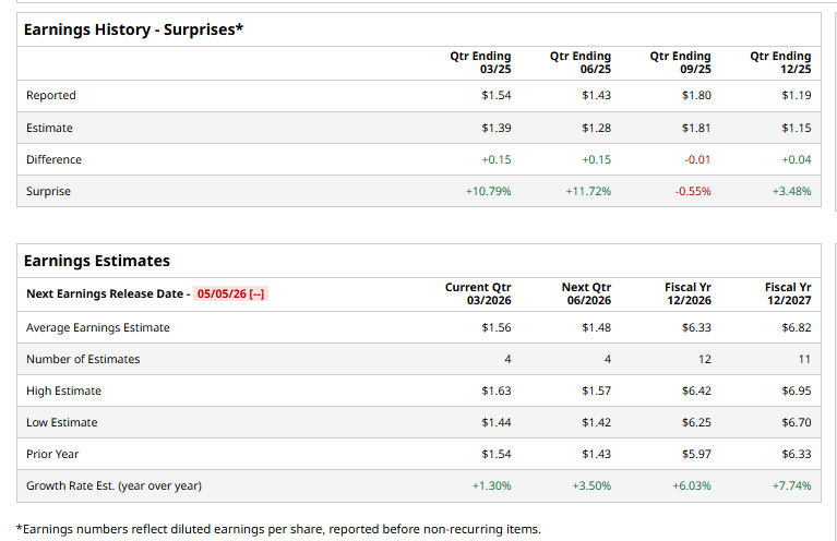 It is scheduled to announce its fiscal Q1 earnings for 2026 soon. Ahead of this event, analysts expect this utility company to report a profit of $1.56 per share, up 1.3% from $1.54 per share in the year-ago quarter. The company has surpassed Wall Street’s earnings estimates in three of the last four quarters, while missing on another occasion.