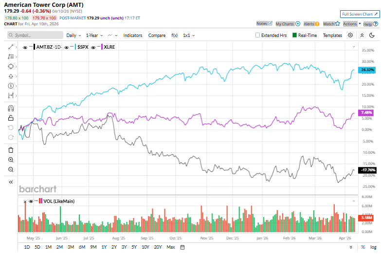Shares of American Tower have declined 13.9% over the past 52 weeks, underperforming the broader S&P 500 Index's ($SPX29.4% gain and the State Street Real Estate Select Sector SPDR ETF's (XLRE11.6% rise over the same time frame.
