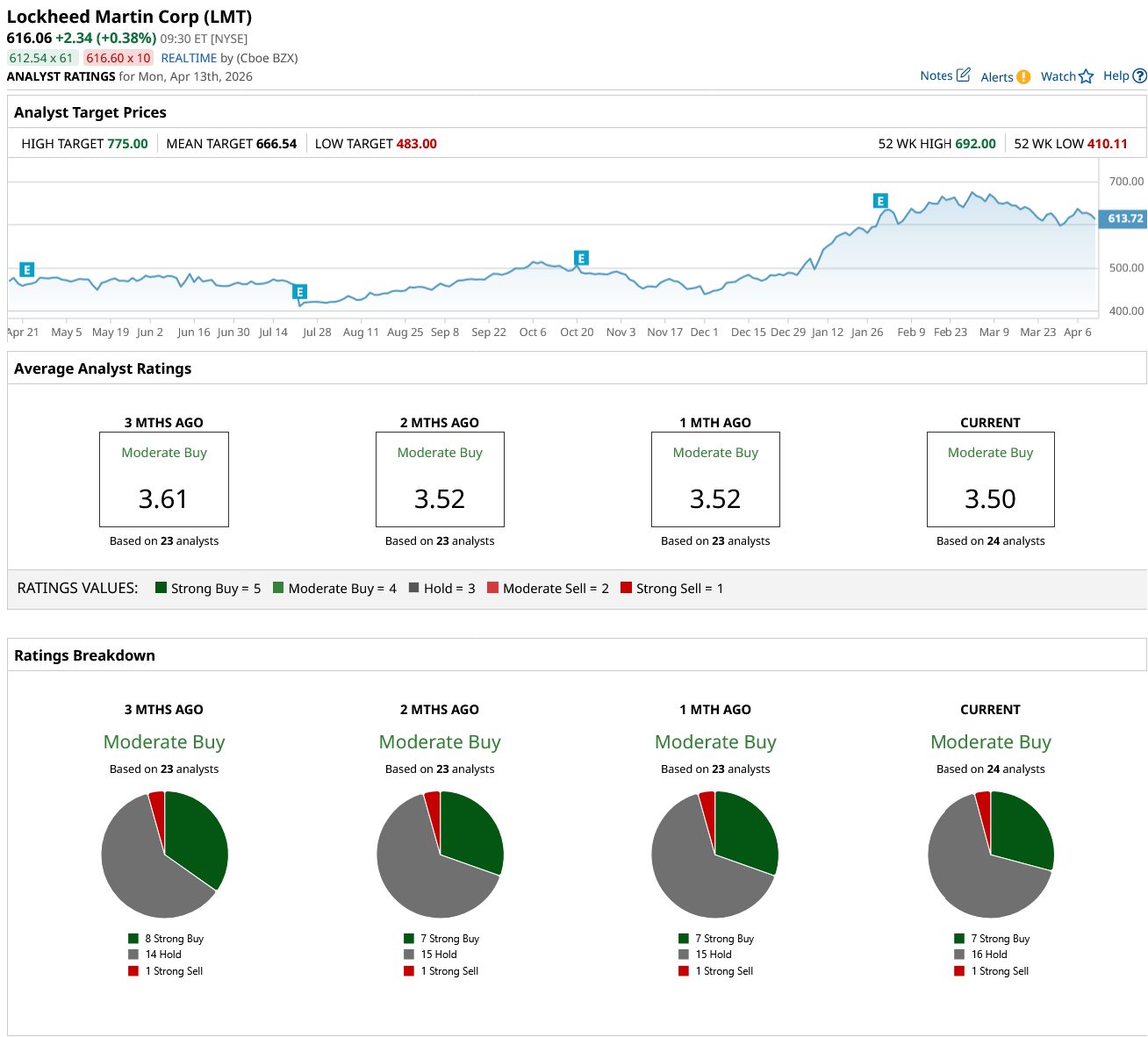 Lockheed Martin remains a "gold standard" for defense exposure, especially as it enters Q1 2026 with record-breaking demand. LMT stock currently holds a consensus "Moderate Buy" rating from 24 analysts, featuring seven “Strong Buy,” 16 “Hold,” and one “Strong Sell” designation. With a mean price target of $666.54, LMT offers a projected 8.1% upside from current levels, though some street-high targets reach as far as $775.
