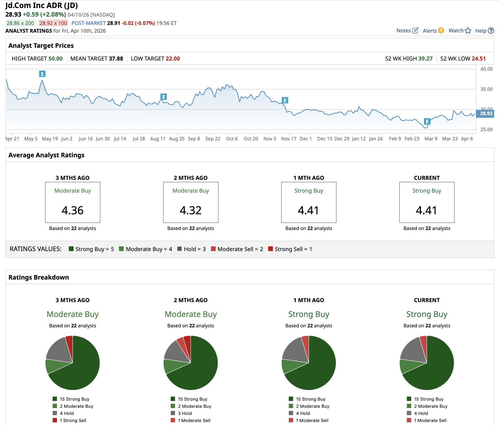 Out of the 22 analysts covering JD stock, 15 recommend “Strong Buy,” two recommend “Moderate Buy,” four recommend “Hold,” and one recommends “Moderate Sell.” The average JD price target is $37.88, above the current price of about $29.