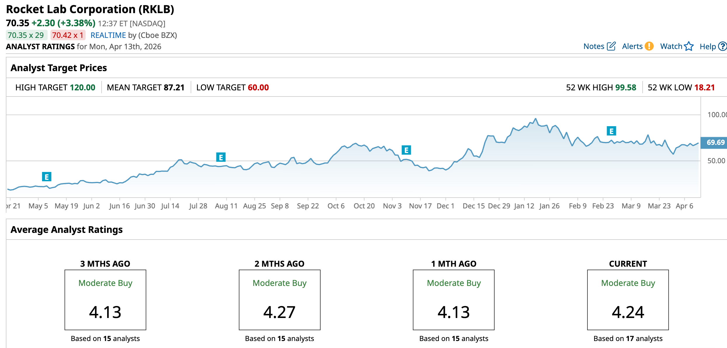 RKLB has an average price target of $87.21, implying roughly 24% upside potential from current levels. On the bullish end, the Street-high target of $120 points to even sharper gains of 70.6%.