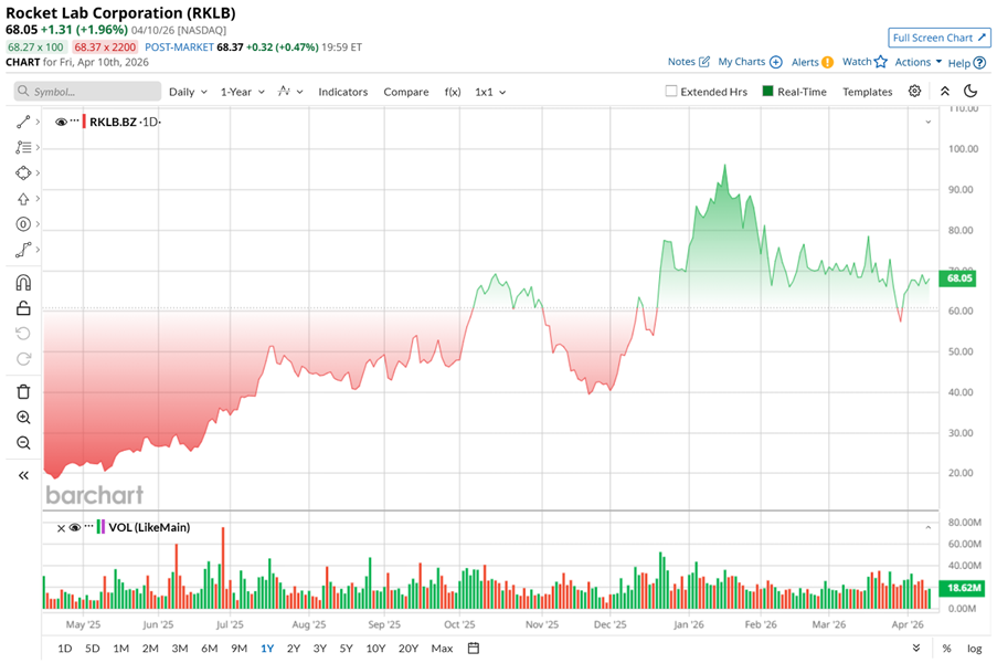 The stock had hit a high of $99.58 in January, but is now about 29% below that level, and in 2026, RKLB is up only marginally at 0.06%. Still, looking at the bigger picture, the stock has delivered strong gains of 255.58% over the past 52 weeks.