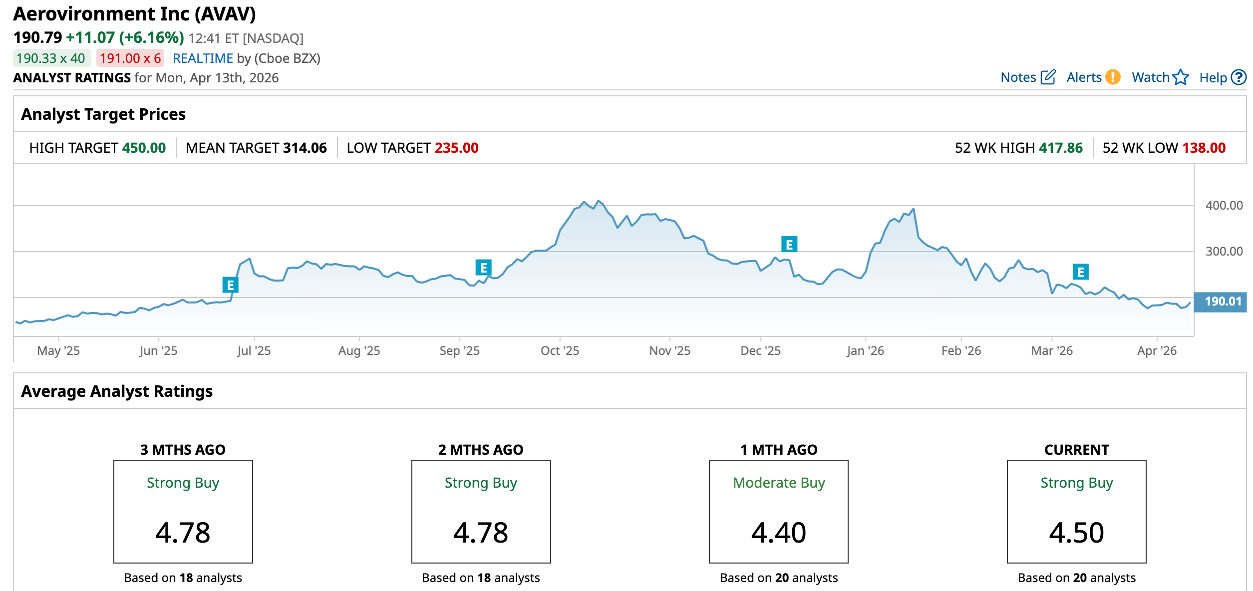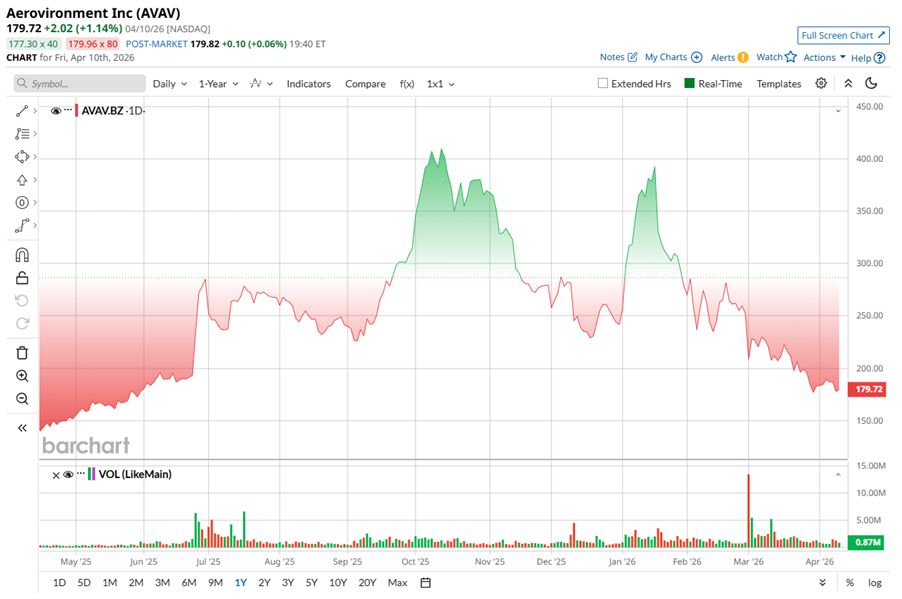 AeroVironment’s stock has had a volatile run in 2026, moving more sideways than trending up. It started strong, climbing close to its all-time high of $417.86 in October, but then saw a sharp pullback, dropping 54.3% from that peak. The stock briefly bounced during a defense-sector rally in March, moving into the mid-$200s, but now sits below $200.