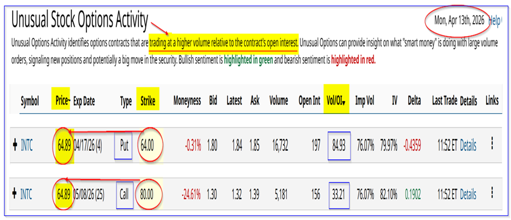 INTC puts expiring April 17 and calls expiring May 8 - Barchart Unusual Stock Options Activity Report - April 13, 2026